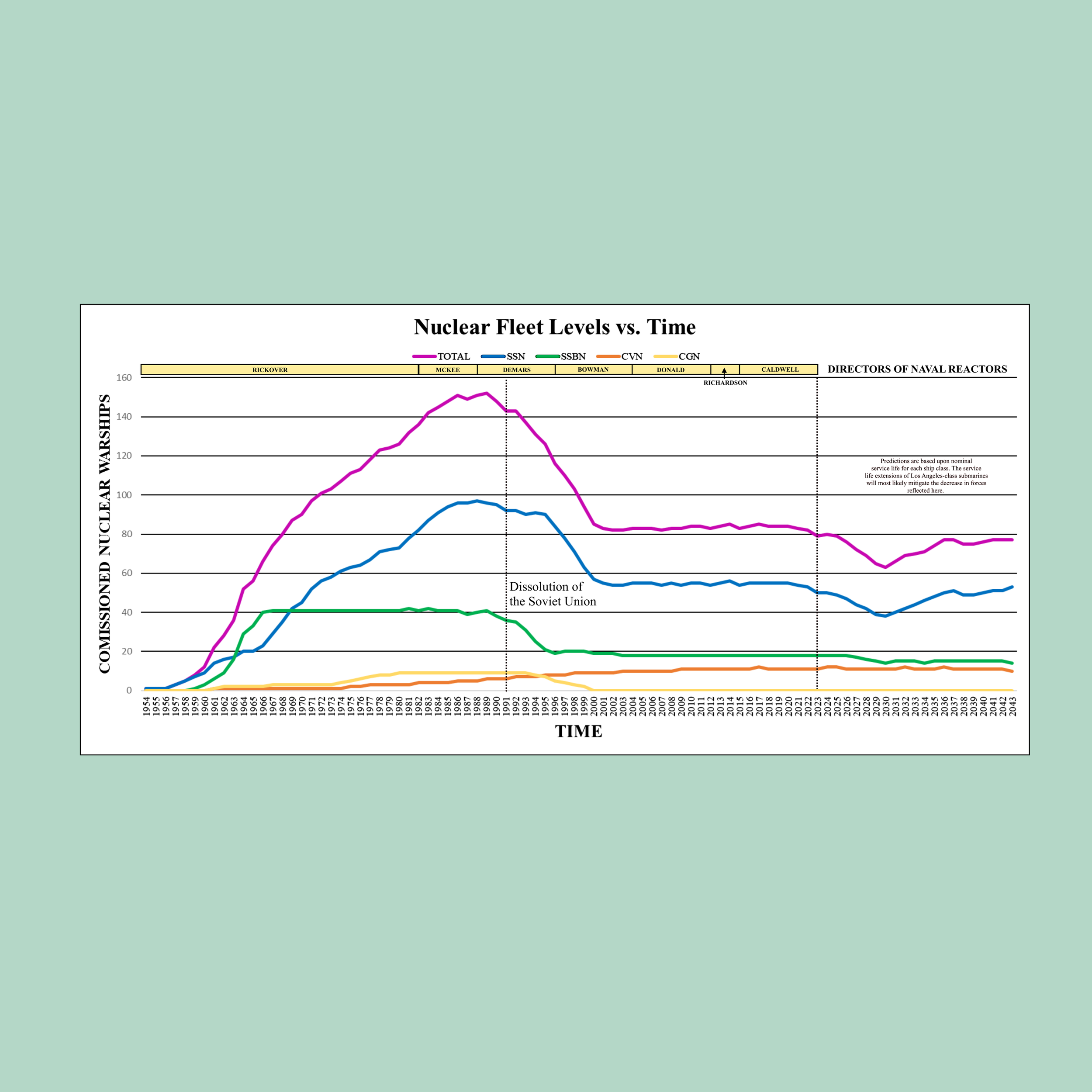 A comprehensive list of all nuclear warships of the United States Navy since the Naval Nuclear Power Program’s inception displayed by individual hull life, fleet levels by class, and Directors by Naval Reactors. Measures 36” x 24”.